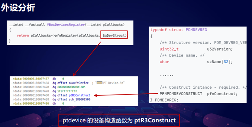 这个设备其实是只有一个外设AAAptdevice 。它位于 VENDORa.dl 里面,然后这去分析DLL 的入口函数叫做VboxDevicesRegister,它里面会去注册gDevStruct,这个结构体定义的外设的名字和构造函数。