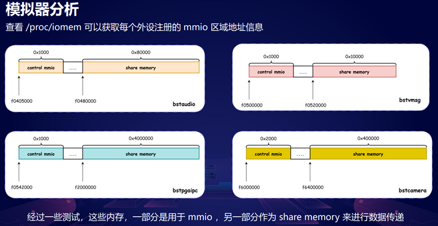 我们主要讲讲这4个外设,它其实每个外设都是类似的一个东西,它有一块内存,然后有一块共享内存做一些控制,比如说 Guest 要和 Host 交互会通过写MMIO通知Host,具体的数据通过共享内存进行传递。