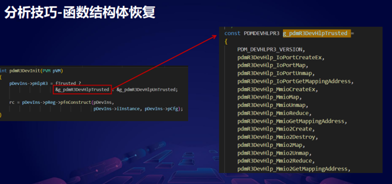 然后我们需要去恢复一些关键的结构体。在VirtualBox里面的话,其实每一个外设它都有一个 devIns 这样一个结构体来管理它里面的一些状态以及一些信息。