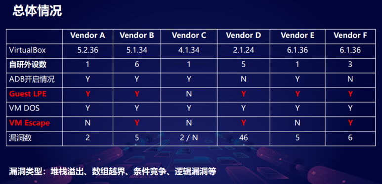 我分析了市面上6款这种安卓模拟器,这几款其实都是会有一些漏洞。至于效果,其实5款我们可以做到用普通apk提到root权限,然后其中的三款是做了虚拟机逃逸的一个exp,漏洞类型的话主要就是一些比较常见的内存漏洞,像这种溢出、数组越界、条件竞争以及一些逻辑漏洞。