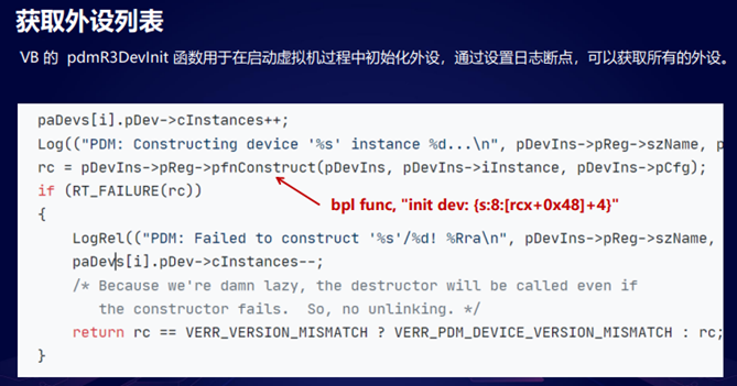 我们找到目标进程之后,需要去定位到它有哪些外设被启用。VirtualBox的pdmR3DevInit 函数的作用是调每个外设的构造函数,初始化外设。