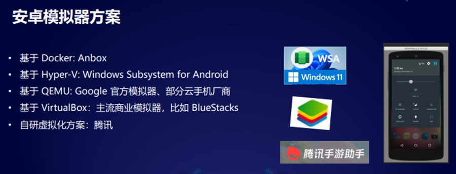 QEMU,QEMU是谷歌的官方模拟器,我了解到有一部分的云手机厂商,他们其实也是基于QEMU去做了一些定制;