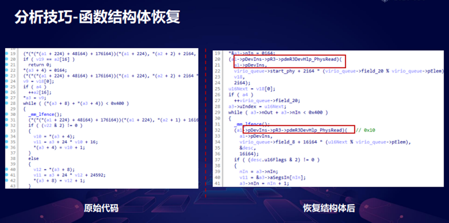 这边是一个我们恢复之后的情况,我们恢复之前它是会有很多那种交指针加引用,然后我们通过调试恢复右侧那种标红的那几个函数之后,我们通过这个函数的使用,可以进一步的去把剩下的一些结构体给它恢复出来,大概恢复完之后就是一个可以人工分析的状态了。