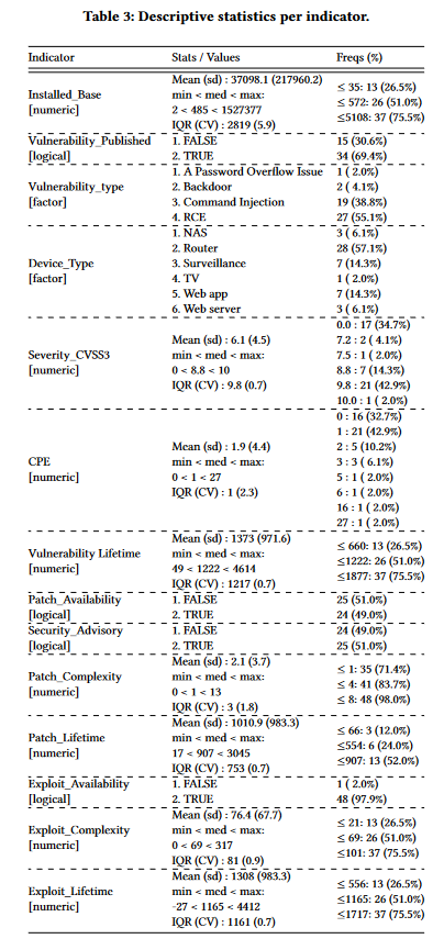 为了测试这一点,作者使用四个指标来衡量。其中一个指标是补丁的可获得性。作者通过确定补丁是否在供应商的网站或安全博客上可用来评估这一点,这导致了第二个指标,供应商的安全咨询的存在。假设安全咨询的存在会导致更多的补丁设备和更少的有漏洞的设备。因为如果制造商或供应商没有有效的公共资源专门发布安全咨询,那么用户更不可能将补丁应用到他们的设备中。然后,如果补丁是可用的,就评估它们的复杂性,因为这可能是用户不更新设备的一个因素。通过统计应用安全咨询中列出的补丁所需的步骤数来实现,因为所涉及的步骤越多,用户成功安装更新的可能性就越小,甚至不愿意安装更新。那么危险就越多。最后一个指标是补丁发布日期,这个也好理解。