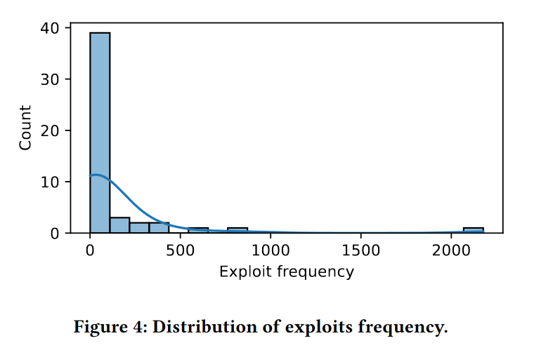 利用频率分布如figure 4所示,在2629个二进制码中,从最小的1到最大的2177次。这导致了高度偏态分布。平均频率约为169,中位数为23。遇到了12次( 24.5 % )在二进制中只出现过一次的利用。在这12次攻击中,除了一次攻击外,所有攻击都针对一个独特的漏洞,而这一漏洞在另一个二进制文件中从未被攻击过。