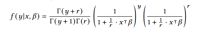 其中,y是利用频率的计数,x是解释变量的向量,β是模型系数的向量,r是负二项族的分散参数。函数Γ为伽马函数,对于正整数n定义为Γ ( n ) = ( n-1 ) !,对于n的其他取值有更一般的定义。