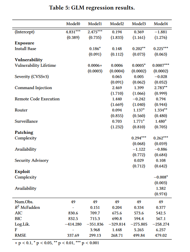 其次,作者使用计数回归模型来分析和量化每个指标的显著性。该模型的输出提供了影响攻击者在选择物联网二进制中包含何种漏洞代码的决策的因素的见解,使我们更好地了解威胁景观,并为提高物联网系统的安全性提出建议。