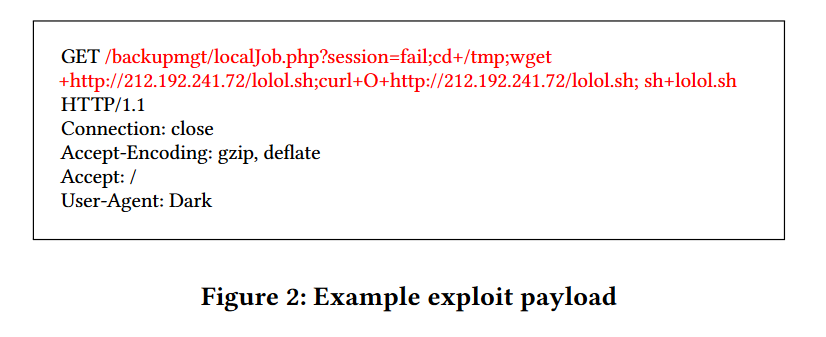 对于从动态分析中捕获的每个有效负载,作者手动提取基于HTTP的请求行和HTTP头,以创建一个独特的子字符串的签名,例如HTTP请求的目标资源,可用于识别攻击。作者使用URI (统一资源标识符)语法或请求行中GET或POST的绝对路径来生成唯一的签名。在figure 2中,作者给出了一个利用负载的例子。这个例子中,最终的利用签名是/ sparemgt / localJob.php ? session = fail。
