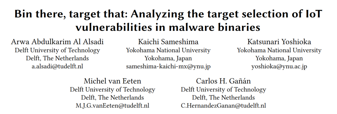 今天给大家分享的文章是一个月前在香港举办的RAID ’23最新鲜出炉的IoT安全相关论文:”Bin there, target that: Analyzing the target selection of IoT vulnerabilities in malware binaries”