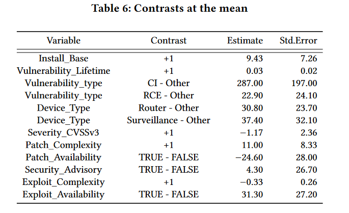 作者关于修补性提出的假设是,物联网设备的补丁会影响利用的频率。补丁的可用性将降低攻击成功的机会。