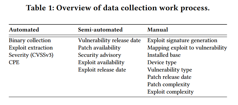 方法论这块涉及两个主要步骤。首先,收集了指标,包括恶意软件二进制文件中的漏洞利用代码的信息,它们利用的漏洞,受影响设备的补丁状态和设备的暴露级别。收集情况如下: