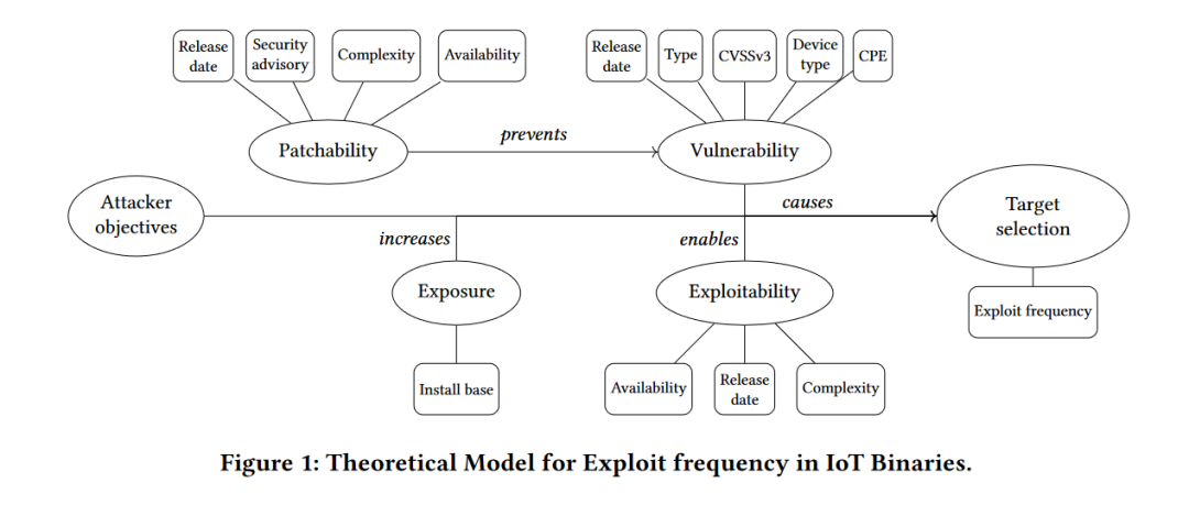 作者创建了一个模型,从影响攻击者成本和收益的四个因素来解释物联网漏洞被攻击的频率。首先,漏洞本身的特征(vulnerabilities),如其严重性,可能会使其对攻击者更具有吸引力。第二,可补丁性(patchability),可能降低收益。如果为有漏洞的物联网设备部署补丁,这可能会减少漏洞利用可以成功妥协的可用攻击面。第三,可利用性(exploitability),考虑了概念证明攻击代码的可用性和复杂性,降低了攻击者的成本。第四,暴露性(exposure),考虑具有漏洞的设备安装基数的大小,较大的安装基数增加了对攻击者的好处。如下图。