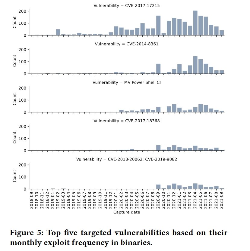 Figure 5给出了最常被利用的前五个漏洞的利用频率的时间序列。发生频率最高的漏洞( 2177次)为CVE-2017-17215。尽管在漏洞发现的时间前后发布了一个补丁,但它仍然以二进制为目标。第二高的是CVE-2014-8361,其针对的是3个不同的漏洞利用,均来自于相同的PoC漏洞利用代码。该漏洞在2014年10月漏洞公布后8个月发布。受CVE-2014-8361影响的设备已经到了报废期,这意味着厂商将不再提供软件升级或解决其中发现的任何新漏洞(