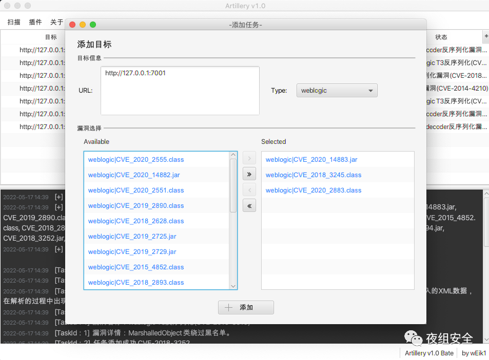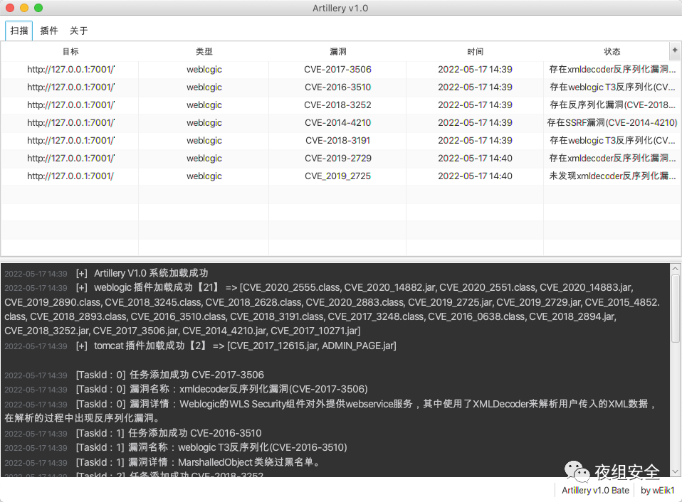 JAVA 插件化漏洞扫描器(Weblogic、Tomcat、Spring…),Gui基于javafx,POC 目前集成 Weblogic(21个),Tomcat(2)、Shiro、Spring等陆续更新中。