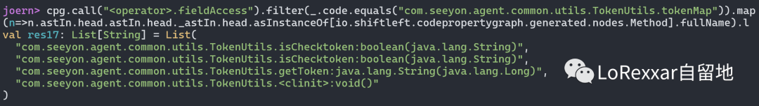 cpg.call("<operator>.fieldAccess").filter(_.code.equals("com.seeyon.agent.common.utils.TokenUtils.tokenMap")).map(n=>n.astIn.head.astIn.head._astIn.head.asInstanceOf[io.shiftleft.codepropertygraph.generated.nodes.Method].fullName).l
