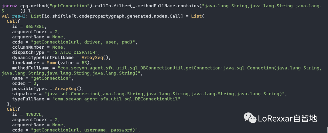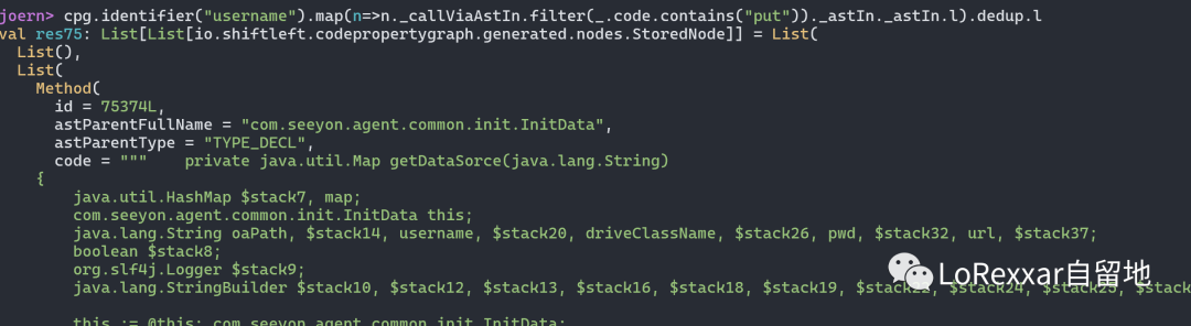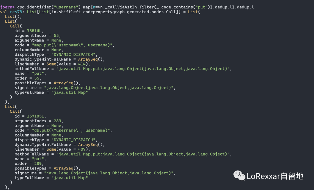 这个很简单,就像我们平时做代码审计的时候,会通过一些关键字来搜索关键代码一样,在joern中,你可以做类似的事情。我们可以搜索变量名为username的变量被调用的位置。
