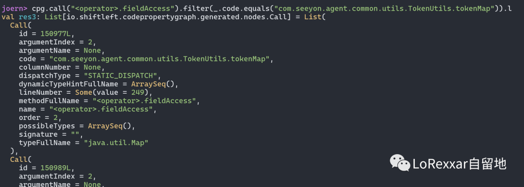 cpg.call("<operator>.fieldAccess").filter(_.code.equals("com.seeyon.agent.common.utils.TokenUtils.tokenMap")).l