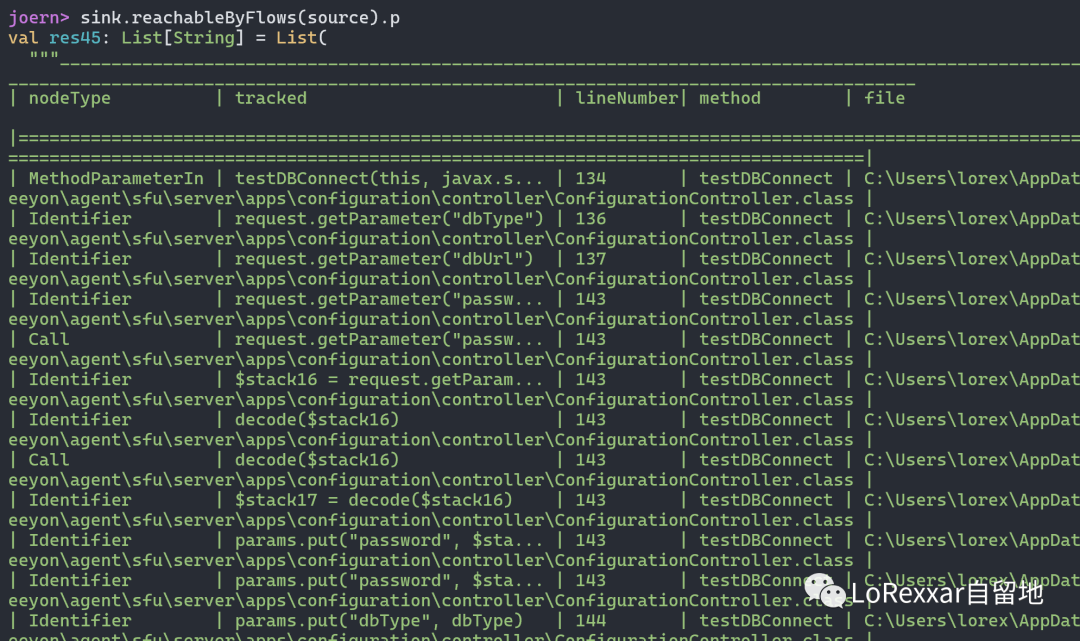 def sink = cpg.method("getConnection").callIn.filter(_.methodFullName.contains("java.lang.String,java.lang.String,java.lang.String"))def source = cpg.method("testDBConnect").where(_.annotation.name(".*Mapping")).parametersink.reachableByFlows(source).p