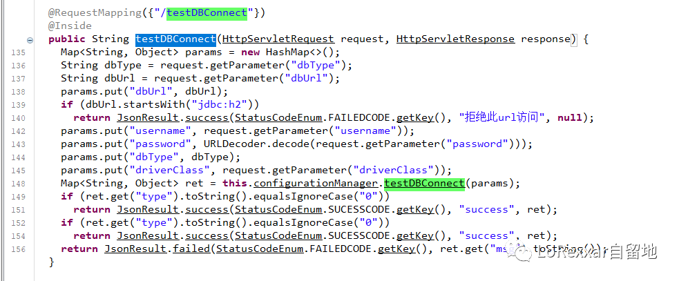 在前面找到对应的利用方案之后,当我们尝试去做利用的时候会发现其实后台有额外的权限验证。直接访问testDBConnenction,会报非法访问的错误。