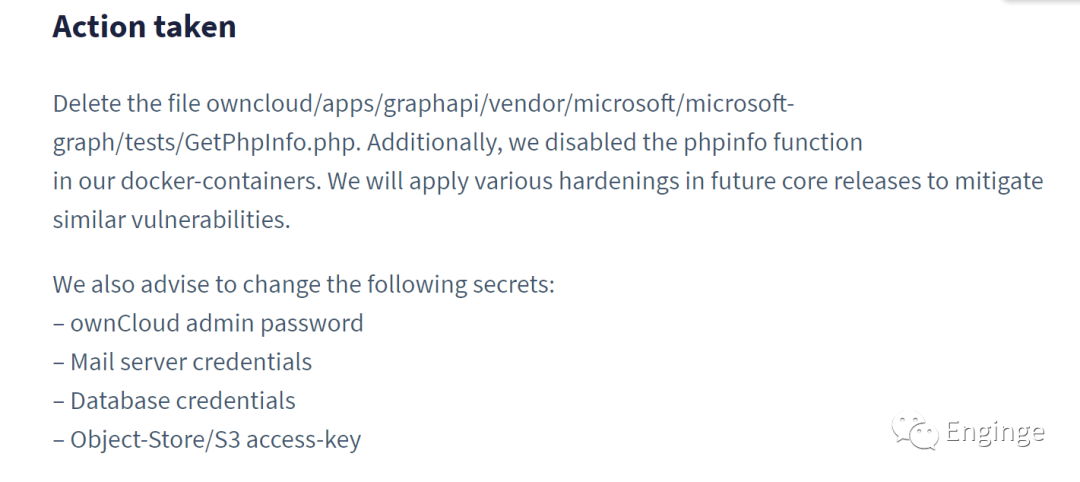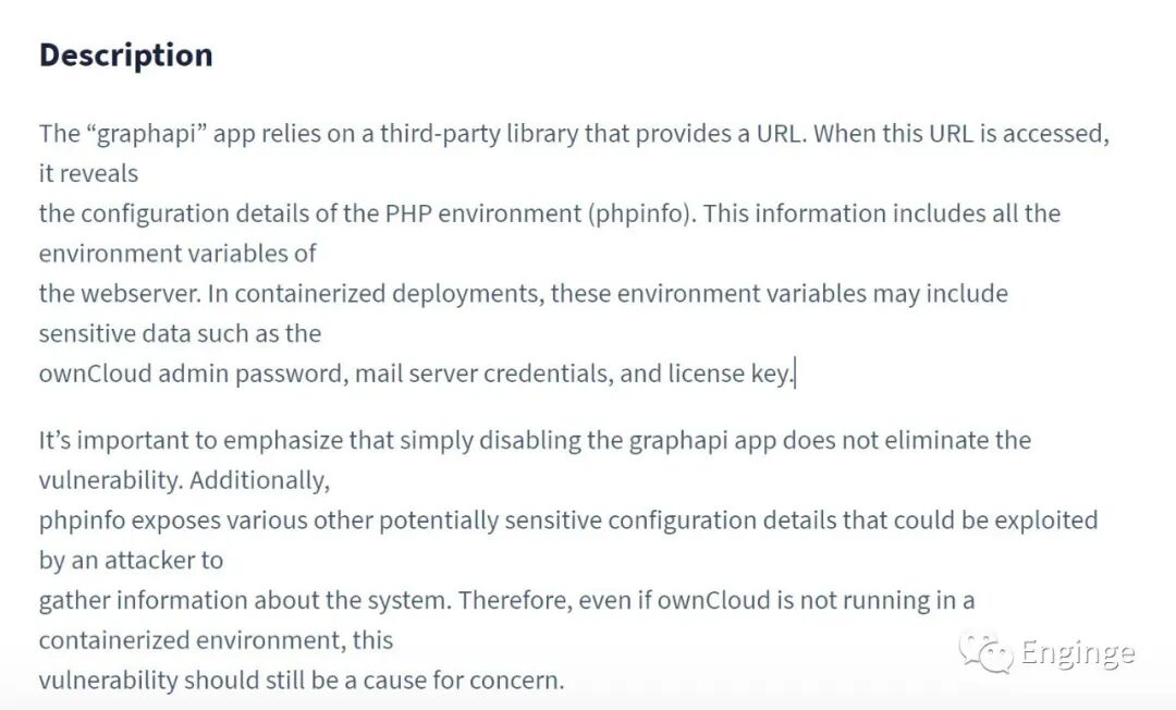 此信息包括Web服务器的所有环境变量,包括敏感数据,如ownCloud管理员密码、邮件服务器凭据和许可证密钥。
