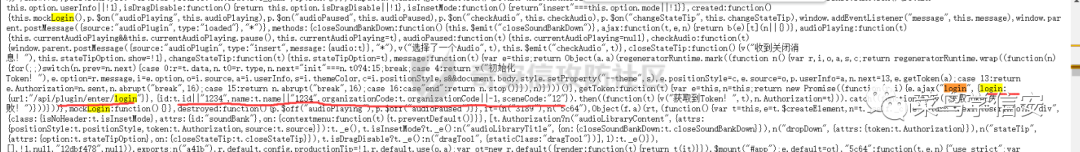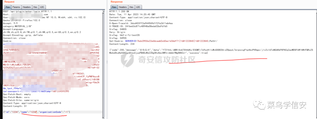 这里贯彻着遇事不决看js的思想,继续来审计js,终于发现了解决方法:其中在js中发现了login接口。这里存在该逻辑漏洞:id:t.id||”1234″,name:t.name||”1234″,organizationCode:t.organizationCode||-1。这里用了||或,那么言下之意就是如果不知道id、name和organizationCode的话,就可以直接id参数和name参数都填1234,organizationCode填-1