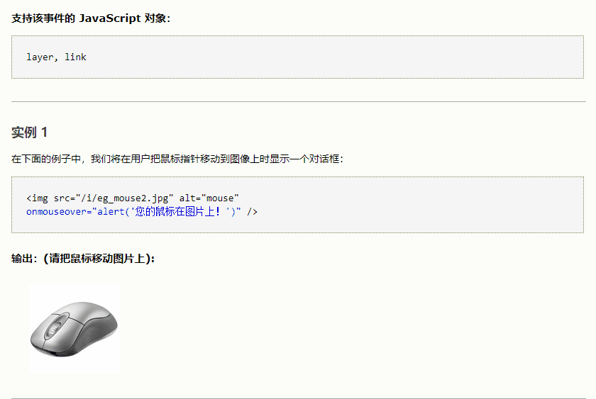 事件通常与函数结合使用,函数不会在事件发生前被执行!onmouseover 事件会在鼠标指针移动到指定的对象上时发生