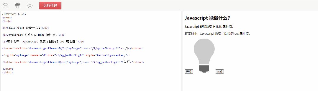 <!DOCTYPE html> <html> <body> <h2>JavaScript 能做什么?< / h2> <p>JavaScript 能够改变 HTML 属性值。< / p> <p>在本例中,JavaScript 改变了图像的 src 属性值。< / p> <button onclick = "document.getElementById('myImage').src='/i/eg_bulbon.gif'" >开灯< / button> <img id = "myImage" border = "0" src = "/i/eg_bulboff.gif" style = "text-align:center;" > <button onclick = "document.getElementById('myImage').src='/i/eg_bulboff.gif'" >关灯< / button> < / body> < / html> |