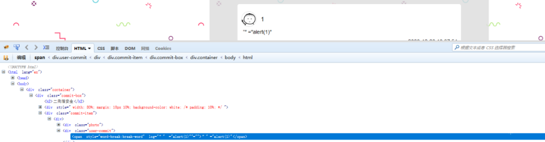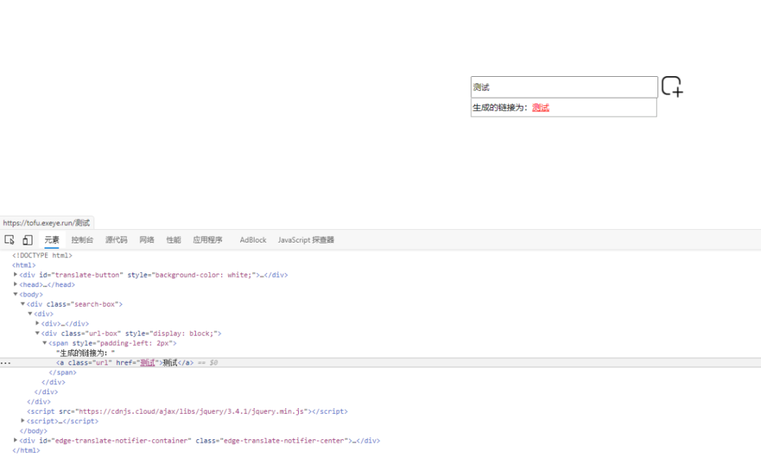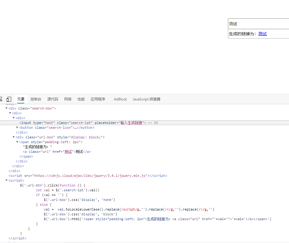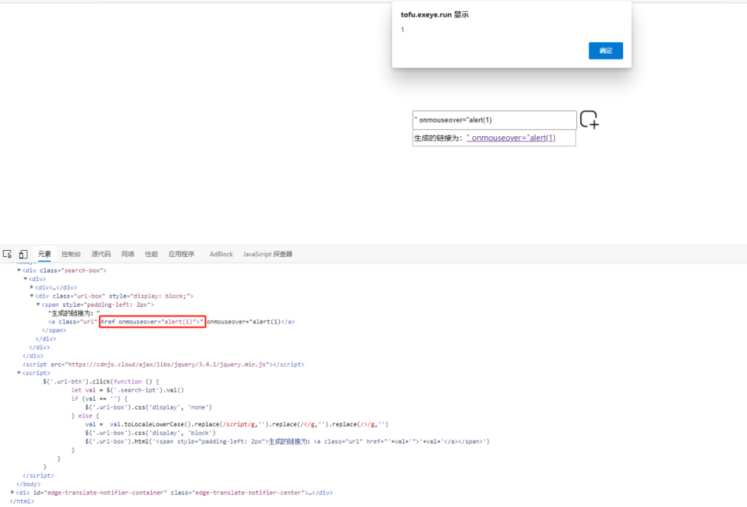 $( '.url-btn' ).click(function () { let val = $( '.search-ipt' ).val() if (val = = '') { $( '.url-box' ).css( 'display' , 'none' ) } else { val = val.toLocaleLowerCase().replace( / script / g,' ').replace(/</g,' ').replace(/>/g,' ') $( '.url-box' ).css( 'display' , 'block' ) $( '.url-box' ).html( '<span style="padding-left: 2px">生成的链接为:<a class="url" href="' + val + '">' + val + '</a></span>' ) } } ) 发现将数据存储在<a标签href属性内 |