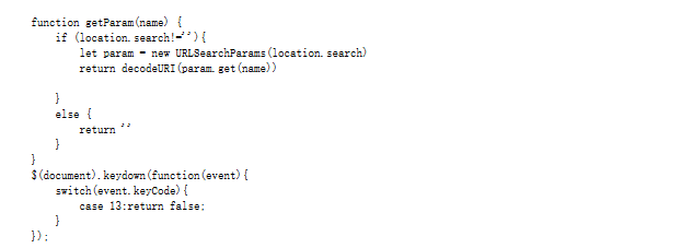 function getParam(name) { if (location.search! = ''){ let param = new URLSearchParams(location.search) return decodeURI(param.get(name)) } 若链接中存在参数,则创建一个对象,值为所有参数,name对应参数名 |