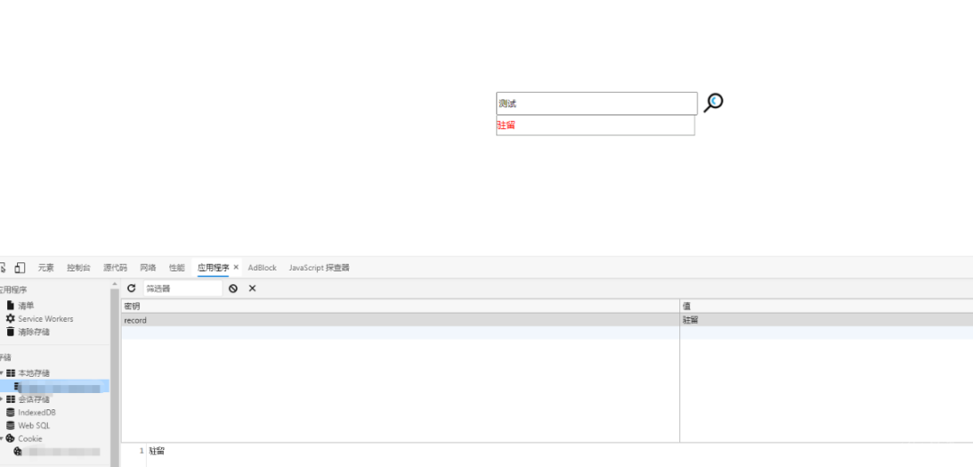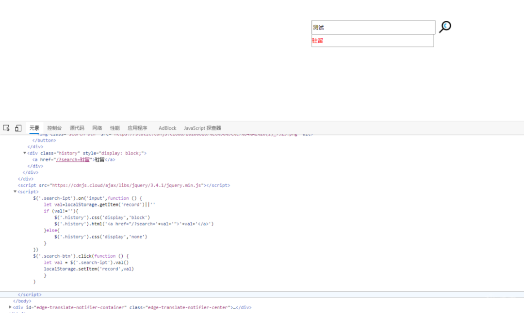 $( '.search-ipt' ).on( 'input' ,function () { let val = localStorage.getItem( 'record' )||'' if (val! = ''){ $( '.history' ).css( 'display' , 'block' ) $( '.history' ).html( '<a href="/?search=' + val + '">' + val + '</a>' ) } else { $( '.history' ).css( 'display' , 'none' ) } }) $( '.search-btn' ).click(function () { let val = $( '.search-ipt' ).val() localStorage.setItem( 'record' ,val) } ) 发现将数据存储在localStorage |