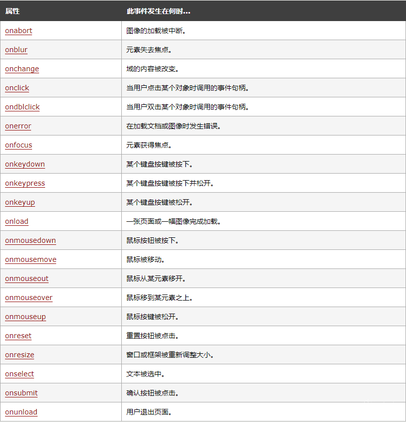 HTML 4.0 的新特性之一是能够使 HTML 事件触发浏览器中的行为,比如当用户点击某个 HTML 元素时启动一段 JavaScript。下面是一个属性列表,可将之插入 HTML 标签以定义事件的行为。 |
