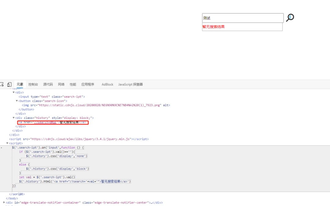 $( '.search-ipt' ).on( 'input' ,function () { if ($( '.search-ipt' ).val() = = ''){ $( '.history' ).css( 'display' , 'none' ) } else { $( '.history' ).css( 'display' , 'block' ) } let val = $( '.search-ipt' ).val() $( '.history' ).html( '<a href="/?search=' + val + '">暂无搜索结果</a>' ) }) 发现取内容放在<a标签内 |