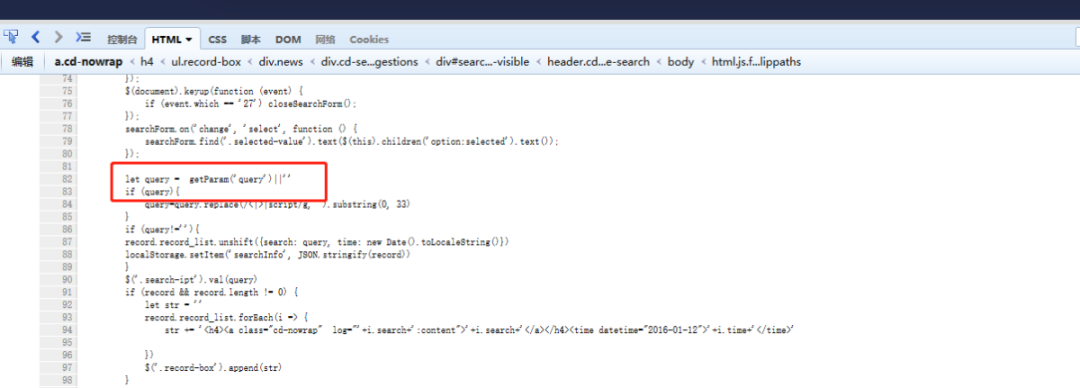 let query = getParam( 'query' )||'' if (query){ query = query.replace( / <|>|script / g,'').substring( 0 , 33 ) 看到使用了query参数,其值为getParam( 'query' ) |
