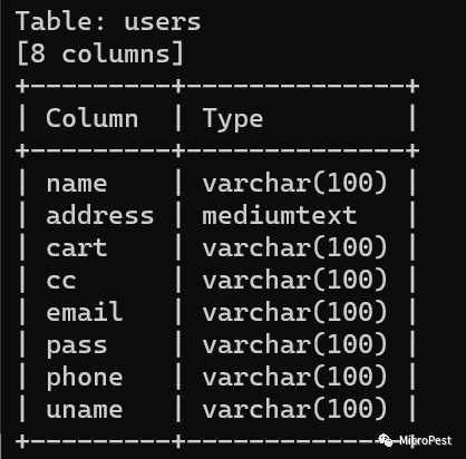 要查看特定表的列,我们可以使用以下命令,其中我们使用 -T 指定表名,并使用 –columns 查询列名。我们将尝试访问表“users”。