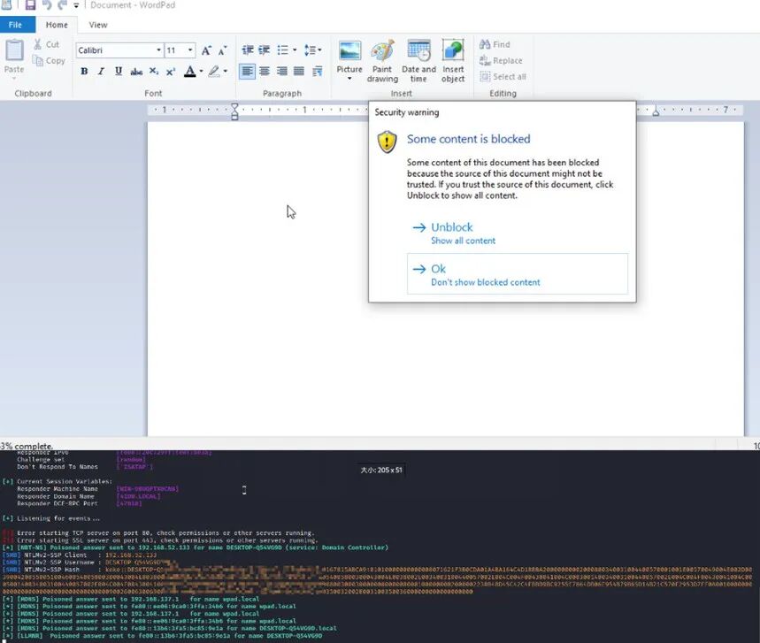 ,wordpad在解析rtf文件包含的ole对象时会尝试访问Linked object的Topic指向的文件,如果Topic是一个UNC路径则会尝试通过网络访问,并尝试使用NTLM认证,导致泄露NTLM hash。