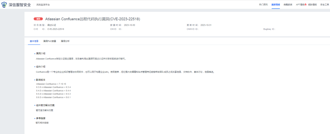 2023年10月31日,深信服安全团队监测到一则Atlassian Confluence组件存在认证绕过漏洞的信息,漏洞编号:CVE-2023-22518,漏洞威胁等级:高危。