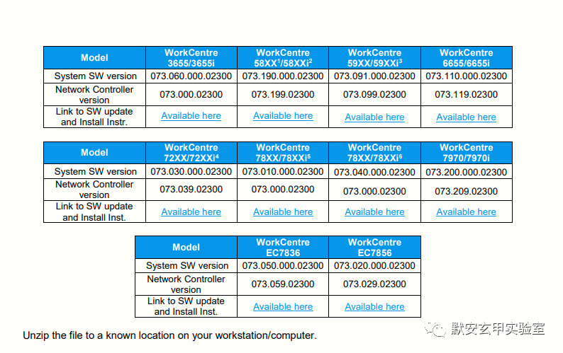 下表列出了易受上述攻击的打印机以及相应的固件补丁。软件版本较低的设备仍然容易受到攻击,应使用施乐提供的补丁。