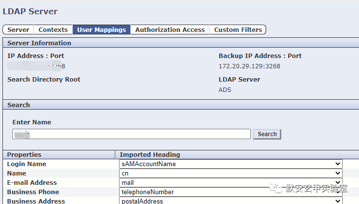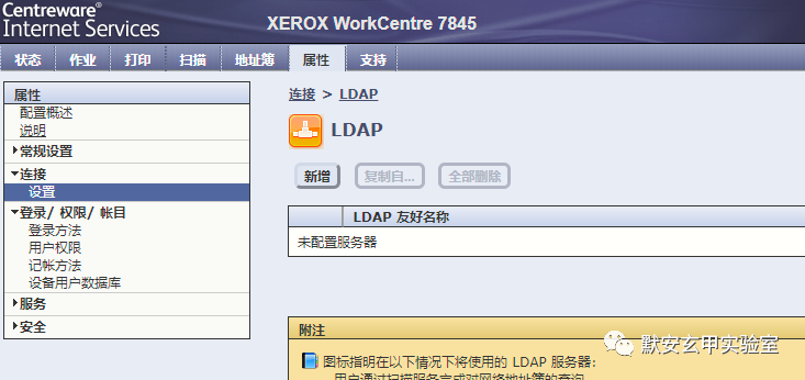接下来,找到在设备上配置的 LDAP 连接,并将服务器 IP 地址或主机名更改为他们自己的 IP 地址,如下图所示。由于此打印机固件不需要在更改其服务器地址之前重新输入或验证 LDAP 凭据,因此攻击者可以很好的进行回传攻击。