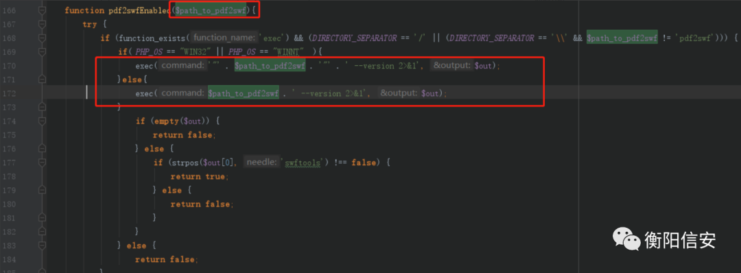 配合任意文件删除把config目录清空,即可成功触发重装机制,执行setup.php并且通过GET请求中PDF2JSON_PATH或PDF2SWF_PATH参数传入payload,造成任意代码执行漏洞