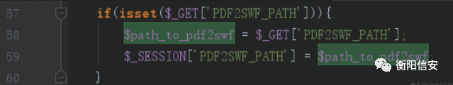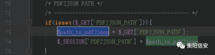 在setup.php中,程序多处调用这两个方法,如上图而传入这两个方法中执行的$path_to_pdf2swf与$path_to_pdf2json变量竟然直接可以从GET请求中传入,见下图