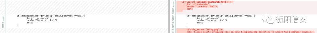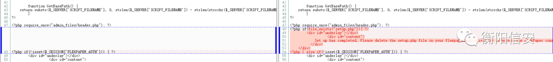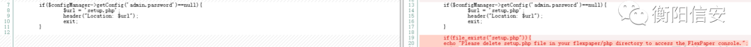 加入了setup.php文件是否存在的判断的代码,当setup.php存在时则报出”Please deletesetup.php file in your flexpaper/php directory to access the FlexPaperconsole.”并且exit。与之相类似的,在Index.php文件中也有类似的检查