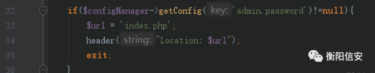 但是在setup.php中,存在如上图代码,会检测admin.password是否为null,来判断系统是否已经安装成功,安装过的系统将会直接触发exit,退出安装流程,也就无法执行后续我们任意代码执行的地方