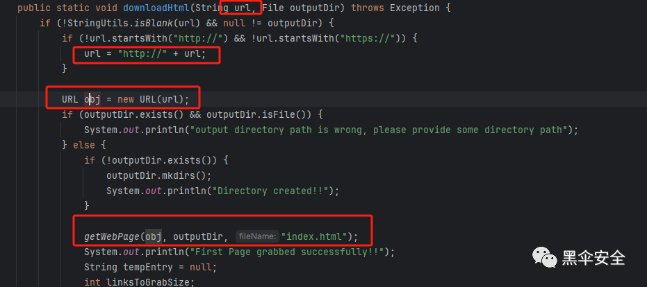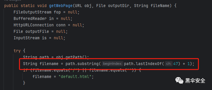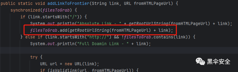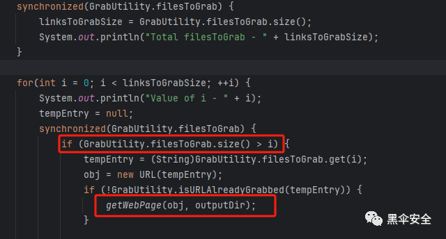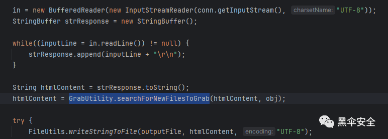 但是下面做的操作就是本此漏洞的关键了,软件本意应该是想做一个比较完善的爬虫,所以接下会调用GrabUtility.searchForNewFilesToGrab