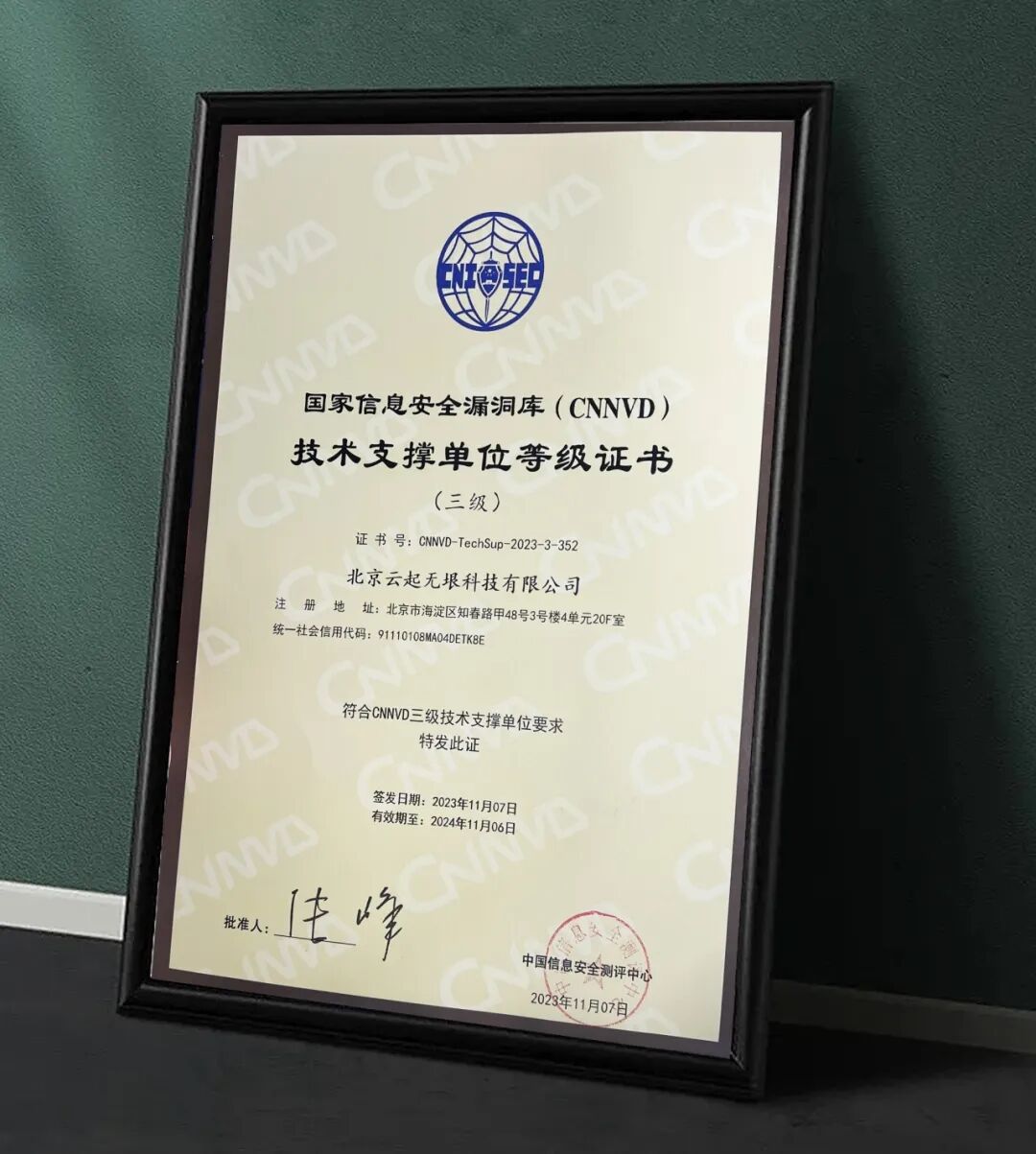 云起无垠凭借其在漏洞挖掘、漏洞检测以及漏洞修复等领域的卓越表现,荣获“国家信息安全漏洞库(CNNVD)技术支撑单位等级证书(三级)”,正式成为CNNVD技术支撑单位。