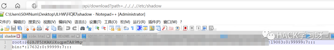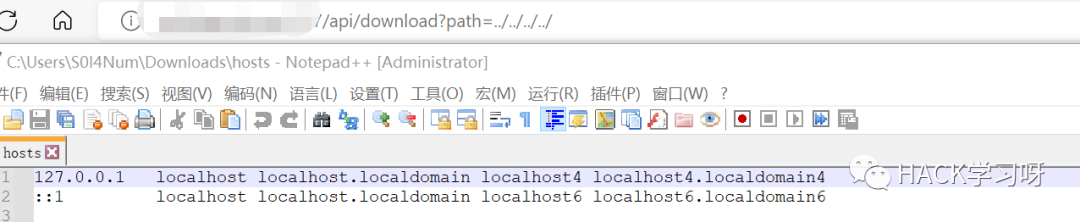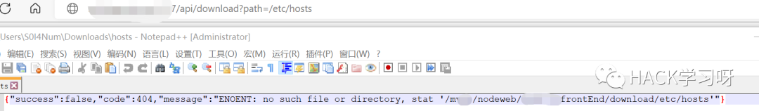 通过上面的报错可知,向上跨越四层目录,就可以到达根目录,于是通过../../../../etc/hosts的payload成功下载到hosts文件
