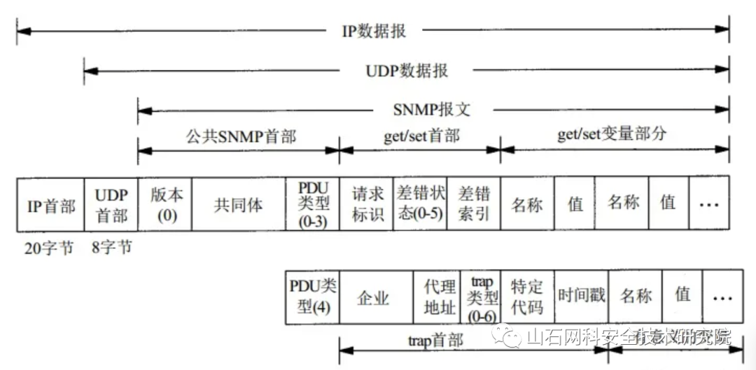 SNMP消息由头部和PDU组成。头部包含版本号、commuity字符串和PDU类型等信息。