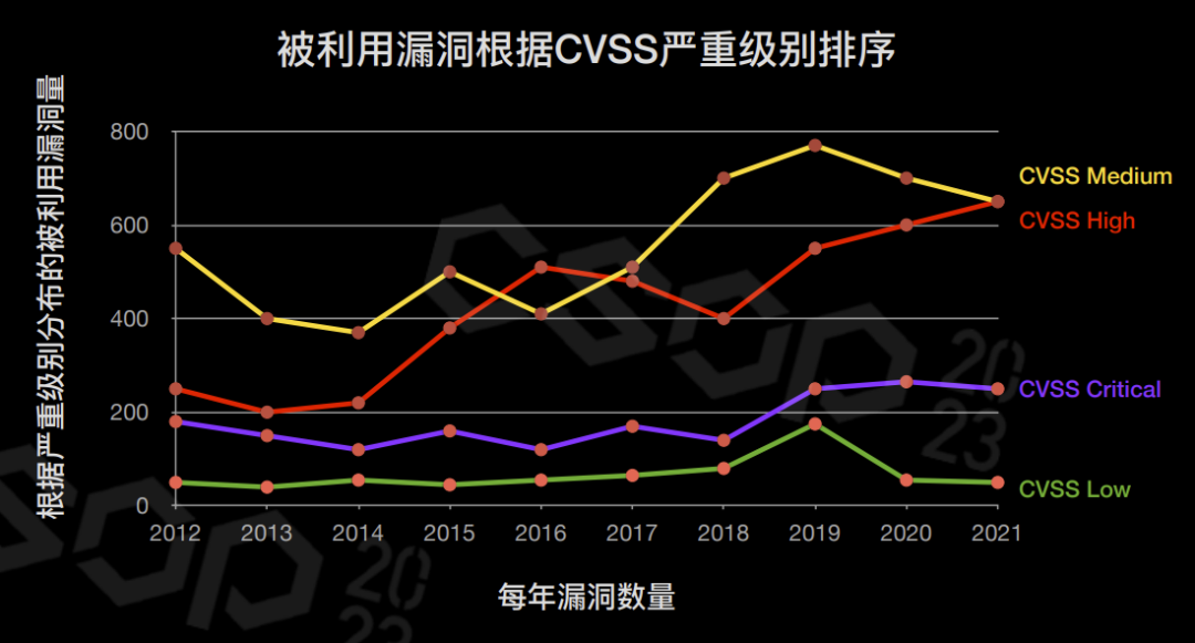 这张图反映了漏洞利用攻击与CVSS评分级别之间的矛盾:CVSS评分越高意味着对软件系统的影响越大,但实际上攻击者利用更多的是那些CVSS评分为“中等”严重级别的漏洞(如上图中的黄色折线)。
