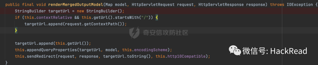这里最终调用的是org.apache.shiro.web.util.RedirectView#renderMergedOutputModel,对loginUrl进行对应的组装后,调用sendRedirect方法重定向: