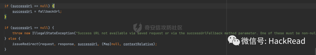 从debug信息也可以看到,此时successUrl第一个字符不再是以//开头了。通过重定向后也无法跳转到www.hacker.com,在一定程度上避免了URL Redirect利用的风险: