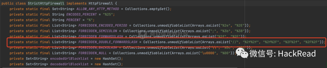 其次,在Spring Security中提供了一个HttpFirewall接口,用于处理掉一些非法请求。其中默认情况下使用的是StrictHttpFirewall这个实现类,在这里对类似//的请求进行了拦截处理: